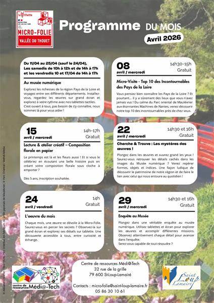 La Micro Folie Vallée du Thouet est un espace culturel innovant qui propose un musée numérique, des ateliers d'arts plastiques et des activités au Fablab. Elle dispose aussi d'un espace de réalité virtuelle, de jeux vidéos et de malettes pédagogiques pour les groupes. Son concept itinérant permet d'apporter la culture au plus près des habitants. La Micro Folie est ouverte les samedis de 10 h à 12 h et de 14 h à 17 h du 11 au 25 avril et les vendredis 10 et 17 avril de 14 h à 17 h. La Micro Folie propose de nombreuses animations. Chaque mois, une thématique défini les animations, les oeuvres exposées... Retrouvez le programme complet dans les images et dans la rubrique "Manifestations" du site.