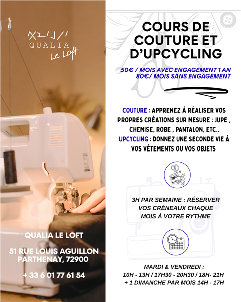 Horaires adaptés selon la proposition d'atelier Cours de couture les mardis et vendredis de 10h à 13h et de 17h30 à 20h30 et un dimanche par mois de 14h à 17h.