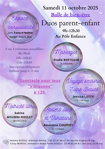 Une matinée "Bulle de bien être en famille" est proposée de 9 h à 13 h, au Pôle Enfance, au 19 rue de la Chaperonnière à Airvault. Des duos parent-enfant sont proposés : massage, voyage sensoriel, motricité libre, ateliers sons et vibrations, espace convivialité... Le Relais Petite Enfance propose de nombreuses animations dans le cadre de la quinzaine de la parentalité qui se déroulera du 6 au 17 octobre. Retrouvez le programme complet dans les images : Temps Parents Enfants le mercredi 8 octobre, chants avec Cédric Noël le mardi 14 octobre, après-midi jeux en famille mercredi 15 octobre, sortie en famille le mercredi 15 et le vendredi 17 octobre. Renseignements et inscriptions aux ateliers : 05 49 63 08 87 / ram.avt@csc79.org.