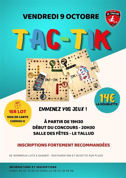 Le club Eveil Foot de Le Tallud organise un Tournoi de Tac-Tik en doublette ce vendredi 10 octobre. Emmenez vos jeux ! De nombreux lots seront à gagner.
