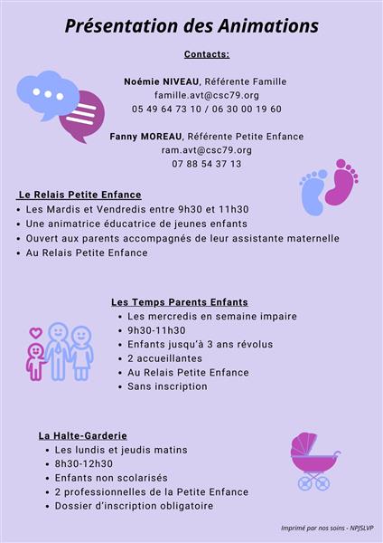 Le Centre Socio Culturel propose des temps de rencontre et de partage dédiés aux futurs parents et aux parents accompagnés de leurs jeunes enfants non scolarisés, au sein du Relais Petite Enfance : les "Temps Parents Enfants". Ces moments privilégiés permettent aux familles de participer à des activités adaptées, encadrées par deux professionnelles de l'enfance et de la famille, qui sont également disponibles pour répondre à vos questions et vous orienter vers des spécialistes si nécessaire. Rendez-vous le mercredi 8 octobre, de 9 h 30 à 11 h 30, au Relais Petite Enfance à Airvault. Pour plus d'informations, veuillez contacter le 05 49 64 73 10 ou le 06 30 00 19 60. Activité gratuite proposée, dans le cadre de la quinzaine de la parentalité. Le programme complet est dans les images : bulle de bien-être le 11, chants le 14, jeux le 15, sortie en famille le 15 et le 17 octobre.