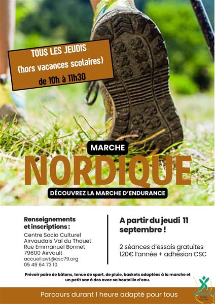 Le Centre Socio Culturel propose une marche nordique, encadrée par un animateur sportif diplômé, tous les jeudis (hors vacances scolaires). Rendez-vous de 10 h à 11 h 30 pour découvrir la marche d'endurance. Prévoir des bâtons, une tenue de sport, de pluie, des baskets adaptées à la marche et un petit sac à dos avec sa bouteille d'eau. Parcours durant 1 h adapté pour tous. Inscription souhaitée au 05 49 64 73 10 ou par mail : accueil.avt@csc79.org