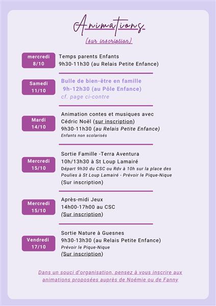 Une après-midi de jeux en famille est proposé de 14 h à 17 h. Rendez-vous au Centre Socio Culturel, au 16 ter rue Emmanuel Bonnet à Airvault. Informations au 05 49 64 73 10. Retrouvez le programme complet de la quinzaine de la parentalité dans les images : Temps Parents Enfants le mercredi 8 octobre, matinée bulle de bien être le samedi 11 octobre, chants avec Cédric Noël le mardi 14 octobre, après-midi jeux en famille le 15 octobre, sortie en famille le mercredi 15 et le vendredi 17 octobre.