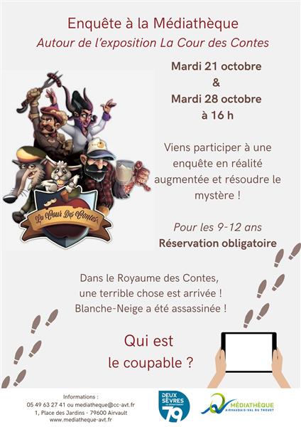 Animation autour de l'exposition "La Cour des Contes", à 16 h. Venez participer en groupe et en famille à une enquête en réalité augmentée avec tablettes et casques audio. "Blanche-neige a été tuée...". Le prince Philippe nous met au parfum illico. Non seulement le drame est épouvantable, mais les personnages se retrouvent au chômage, faute de conte. Il faut trouver le coupable ! Animation gratuite, de 9 à 12 ans. Réservation obligatoire au 05 49 63 27 41 ou à l'adresse mediatheque@cc-avt.fr. L'animation est également proposée le mardi 28 octobre.