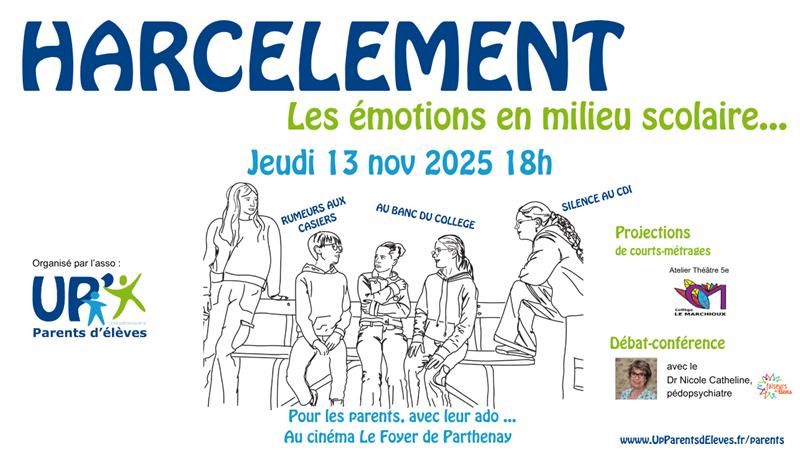 L'association UP (Union parthenaisienne des parents d'élèves) vous propose une conférence le jeudi 13 novembre à 18h au cinéma Le foyer à Parthenay autour de la question du Harcèlementt scolaire...