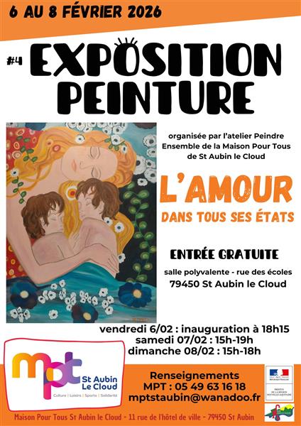 4ème exposition de peinture organisée par les peintres de la MPT de St Aubin le Cloud. Le thème cette année "l'amour dans tous ses états" : on va se régaler de bonheur, de tendresse, de joie et d'amour ! A voir sans modération !