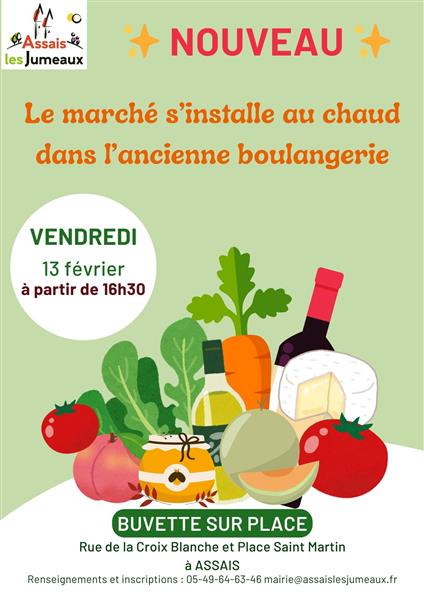 La commune d'Assais-les-Jumeaux propose un marché mensuel le deuxième vendredi de chaque mois, à partir de 16 h 30. Ce vendredi 13 février, le marché est proposé au chaud, dans les locaux de l'ancienne boulangerie, Rue Croix Blanche et Place Saint-Martin.