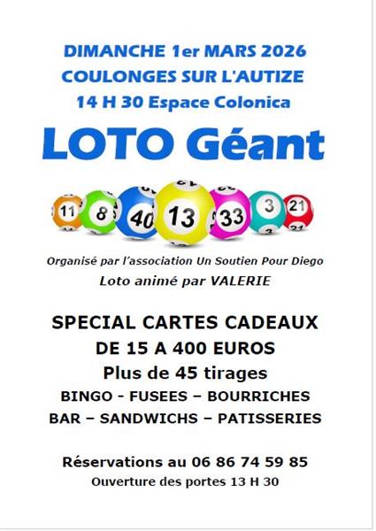Dimanche 1 mars 2026 à 14h30, loto à l'espace Colonica de Coulonges sur l'Autize,