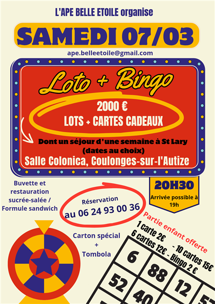 L'APE Belle étoile organise son grand LOTO + BINGO, spécial enfant, le samedi 07 mars à l'espace Colonica de Coulonges-sur-l’Autize.