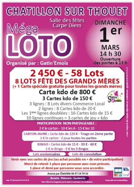 MEGA LOTO organisé par l'Association Gâtin'Emois, au profit de l'Association Gâtin'Emois