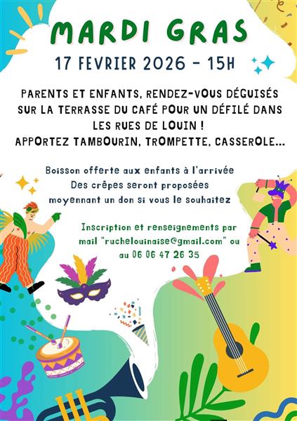 Parents et enfants, rendez-vous déguisés sur la terrasse du café à 15 h, pour un défilé dans les rues de Louin ! Apportez tambourin, trompette, casserole... Boisson offerte aux enfants à l'arrivée, des crêpes seront proposées moyennant un don si vous le souhaitez. Inscription et renseignements par mail : ruchelouinaise@gmail.com ou au 06 06 47 26 35.