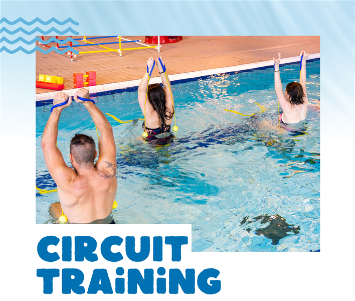 Circuit training : cours collectif encadré par un éducateur; circuit dans l'eau mélangeant 3 activités : aquagym, aquabike et trampoline immergé , le tout en rythme et dynamique.