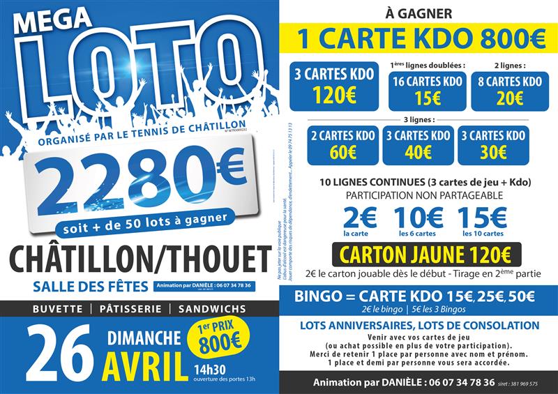 Mega loto animé par Danièle et organisé par le Tennis club de Chatillon sur Thouet le dimanche 26 avril 2026.